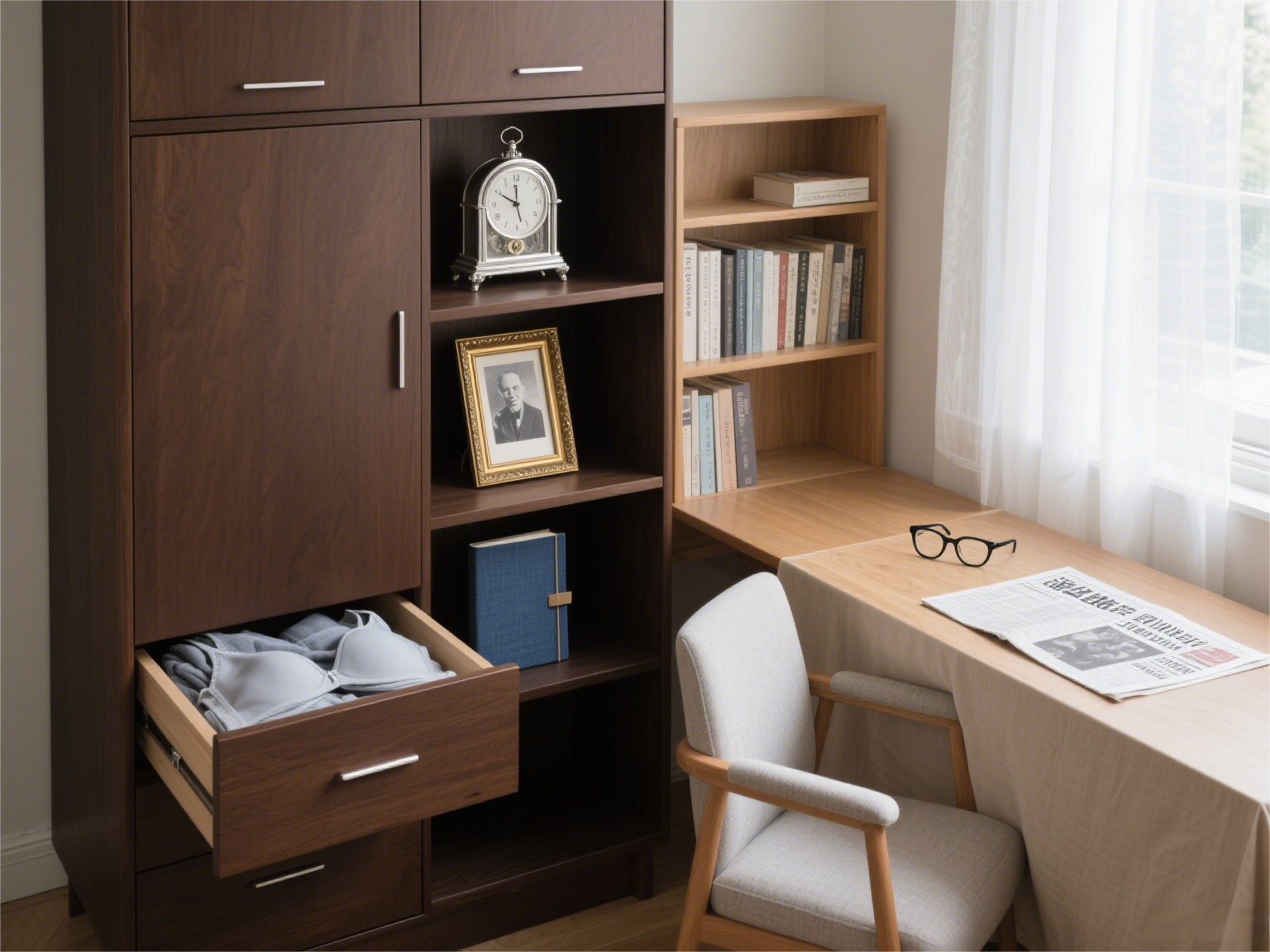 综合柜最 “贴心”:别用全封闭柜(找东西得翻半天),也别用全开放架(积灰难打扫)。选 “半开半闭” 的综合柜:下方做封闭抽屉(放内衣、袜子,抽拉省力),中间留开放格(摆相框、常用药盒,抬手就够),上方做顶柜(放换季被子,配折叠踏脚凳,不用踮脚)。