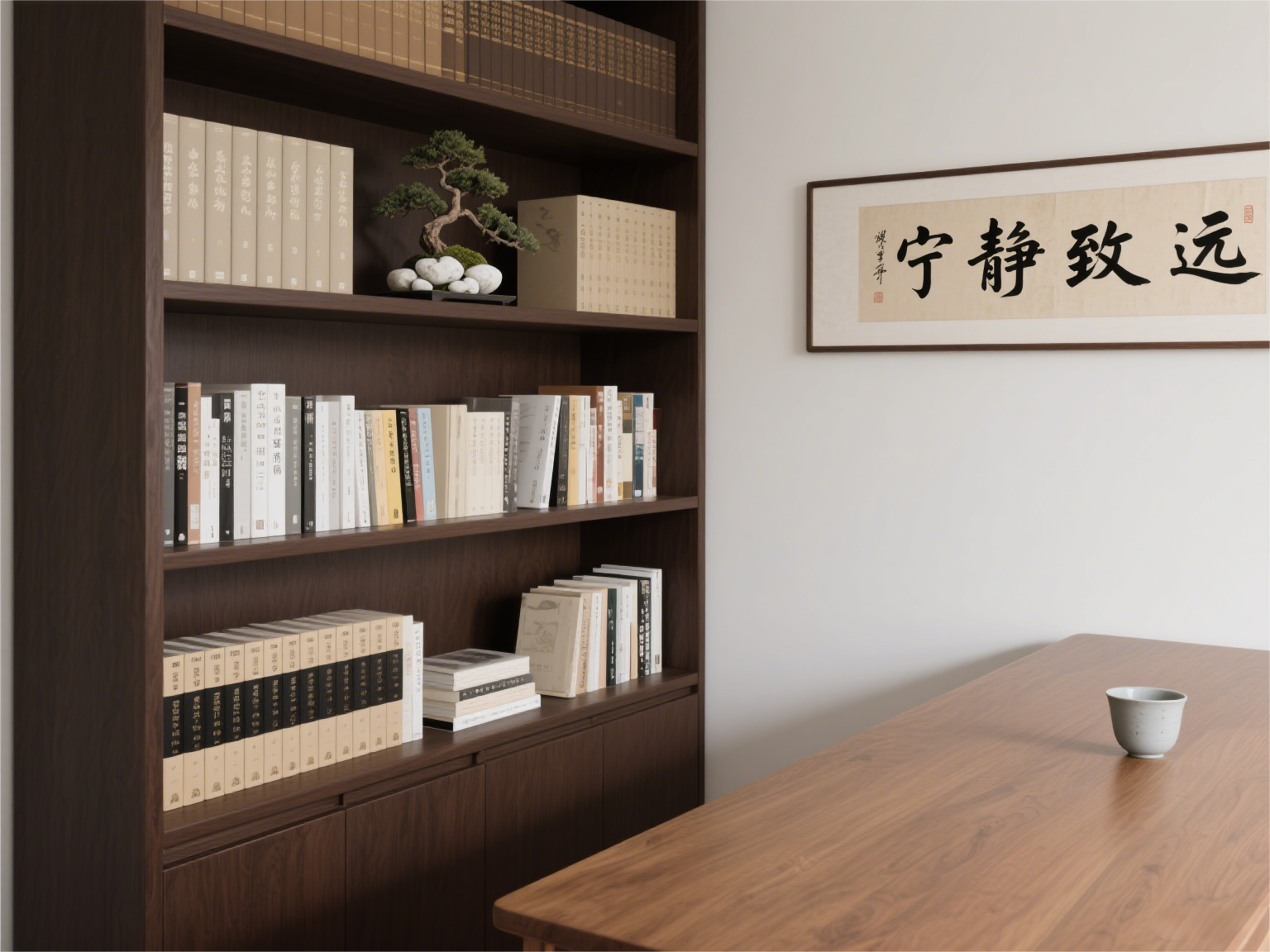 小物件藏着巧思:墙上挂一幅水墨山水(留白多一点,显开阔),或主人自己写的毛笔字(哪怕只是 “静” 字)。书柜顶层放一盆微型盆景(比如雀梅,枝干虬曲有韵味),书桌一角摆一个青瓷笔洗,里面插几支毛笔。这些物件不用多,却能让空间有 “呼吸感”,仿佛随时能听到翻书声与茶香的碰撞。