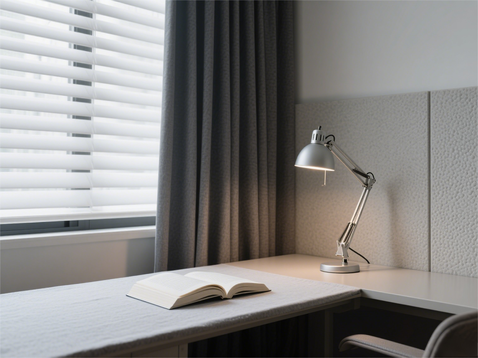 选对材料,把噪音挡在门外:墙面用硅藻泥或吸音板(表面有细小孔隙,能吸收杂音),地面铺实木地板或厚地毯(脚步声会轻很多)。如果书房靠近客厅或马路,装一扇密封性好的实木门,再挂一层厚窗帘(亚麻或棉麻材质),既能隔光,又能像 “海绵” 一样吸收外界的喧嚣。