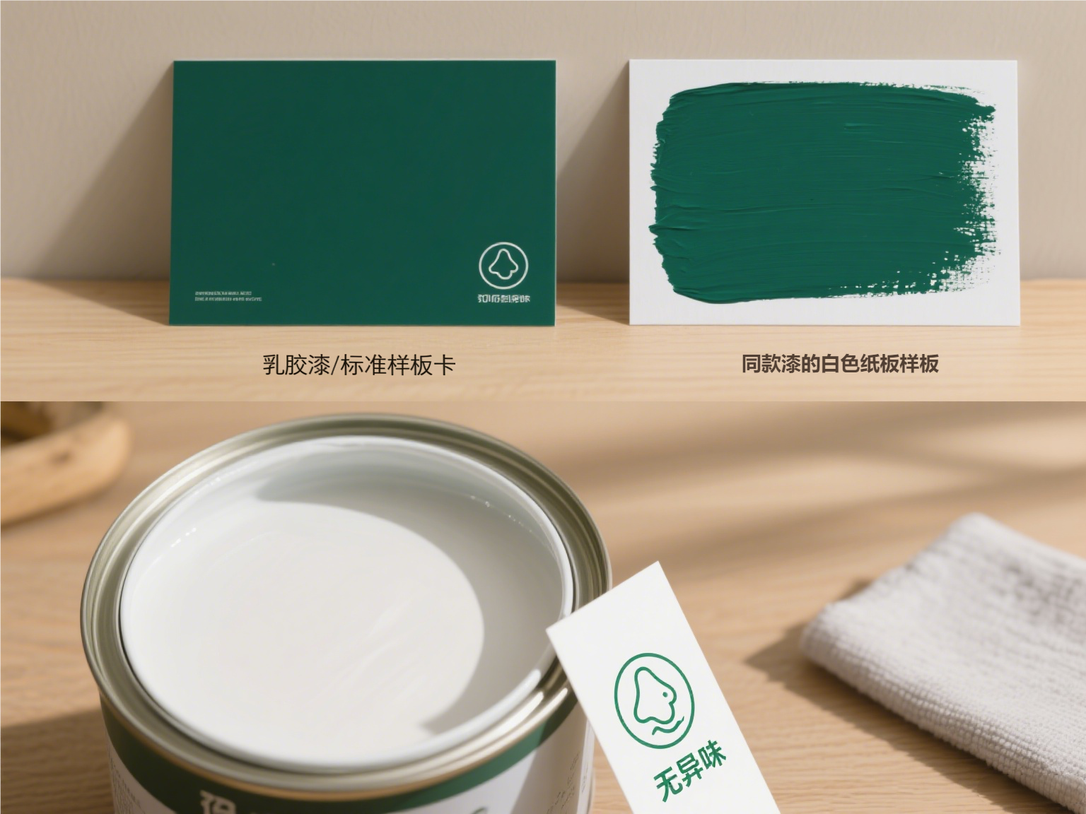 让销售人员拿出该款乳胶漆的标准样板卡(品牌官方制作,颜色和质感都是 “理想状态”),把你刚涂好的样板(或店员提供的成品样板)和标准卡放在一起,在自然光下对比:如果两者颜色均匀一致,没有明显深浅差异,涂膜表面(哑光、柔光、丝光)也能对应上,说明漆的色相纯正,刷在家里不会 “翻车”;要是色差明显,比如标准卡是浅杏色,样板偏黄或偏灰,就算当时觉得 “差不多”,刷满墙后会特别显眼,后悔都来不及。