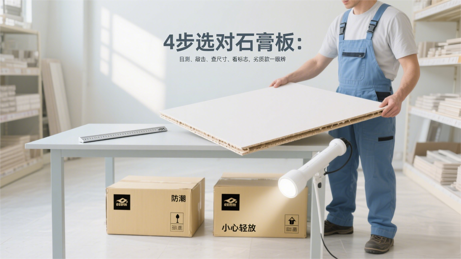 选购石膏板可按 4 步鉴别:目测检查表面(平整无瑕疵、牛皮纸结实)与侧面(石膏密实);敲击听声(实声优、空声差)并掂分量(足重耐用);核查尺寸偏差、平面度与直角,避免拼缝丑;查看包装箱标志(含质量等级、生产日期等),避三无产品。按此方法可轻松选优质石膏板。