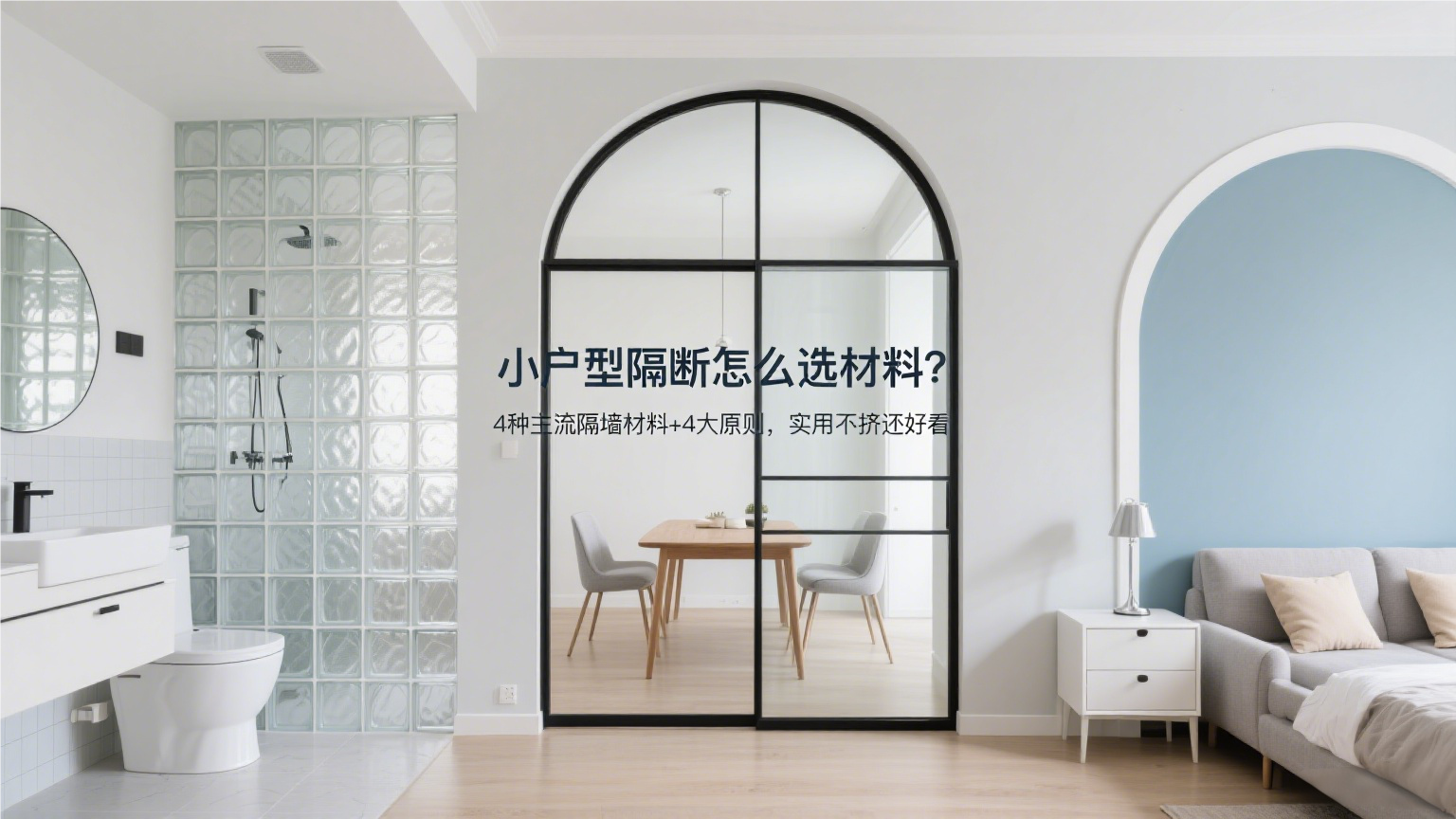 小户型隔断常用 4 种隔墙材料:玻璃砖防水防火透光,适配厨卫;玻璃边框隔断通透,适合客餐厅 / 厨餐;石膏板花纹多、性价比高,需专业施工;另有矮墙、柜子等灵活款。选料需遵循 4 原则:按空间定功能(厨卫防水火、卧室隔音)、保证强度、不挤空间、视觉不压抑,让隔断实用又显大。