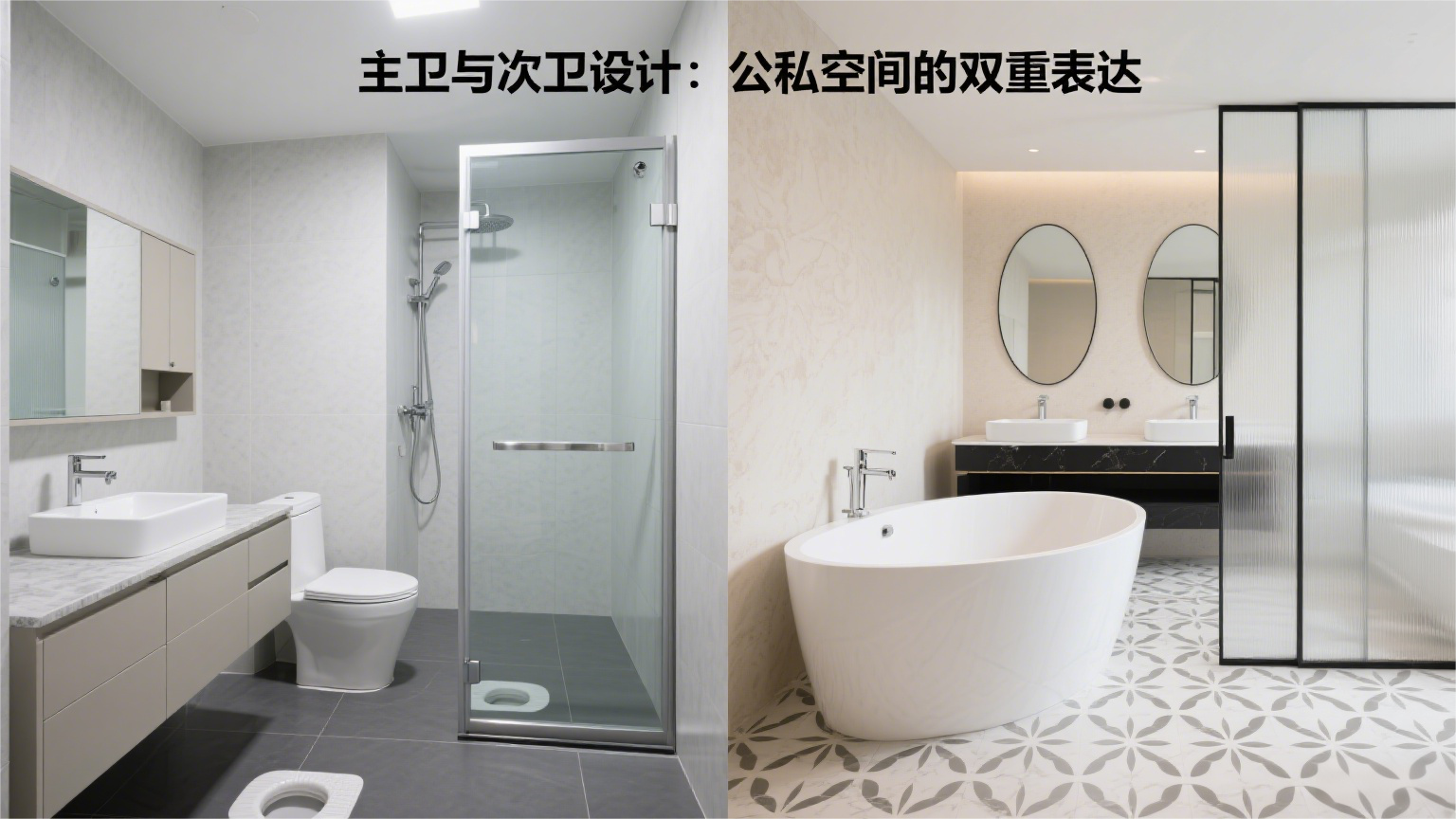 次卫生间服务访客与共用,设计侧重实用耐脏,配蹲式马桶与淋浴房,选中性色调耐磨材料,注重隐私。主卫生间为私人空间,面积更大,划分干湿区,可设浴缸与梳妆角,选用高档材料与智能洁具,风格呼应主卧,彰显个性,满足舒适需求。