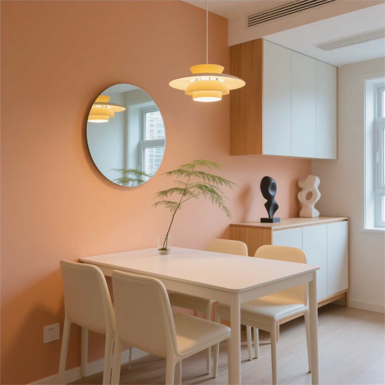 营造餐厅气氛需兼顾风格统一与个性。色彩以明朗暖调为主,如橘黄色,可增进食欲;灯光分主光源(暖黄高照度)与背景光源(可冷暖调节);陈设品要精炼有创意,搭配绿植点缀。大户型可造宴会厅,小户型借镜子扩空间,让用餐氛围更温馨。