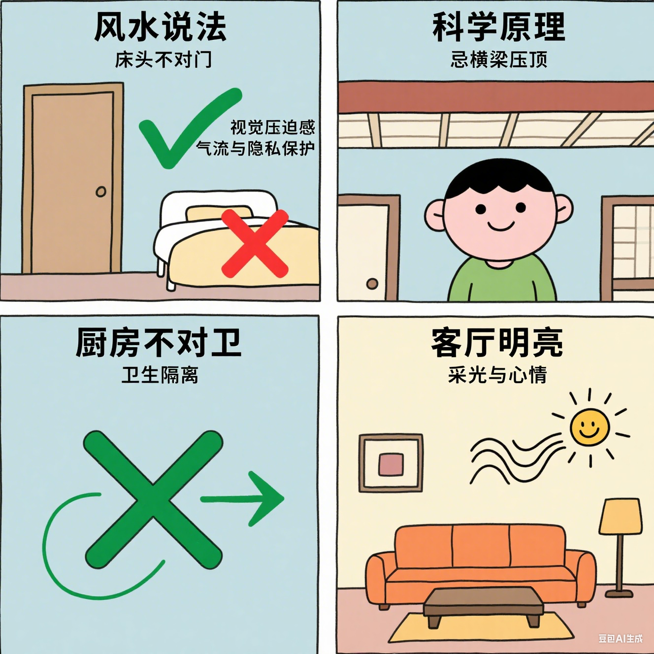 家庭装修中的 “家相风水” 蕴含部分科学道理。传统风水的 “龙真、穴的、砂环、水抱” 等原则,与现代环境学的地质安全、通风采光、水源便利等要求相通。如 “床头不对门” 关乎睡眠质量,“忌横梁压顶” 涉及心理舒适,这些可归结为对居住环境的合理规划。我们应理性看待,取其科学成分,摒弃伪科学,让装修服务于舒适生活。