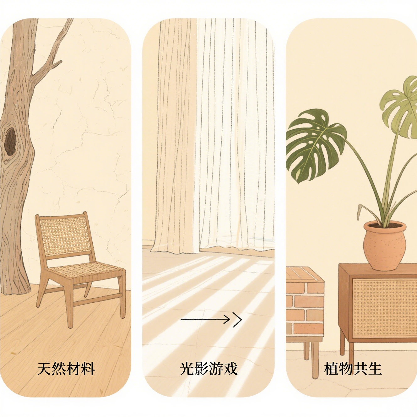 乡土与自然风格以 “回归本真” 为核心,强调运用天然材料(木、石、藤、砖等),保留其原始肌理与温度。自然风格注重光影与植物的融合,田园风格侧重休闲舒畅的生活气息,乡土风格则融入地方传统元素(如清水砖、老工艺)。设计关键在于提炼而非复制,通过现代手法让自然与乡土元素适配当代生活,营造质朴、舒适且有温度的空间。