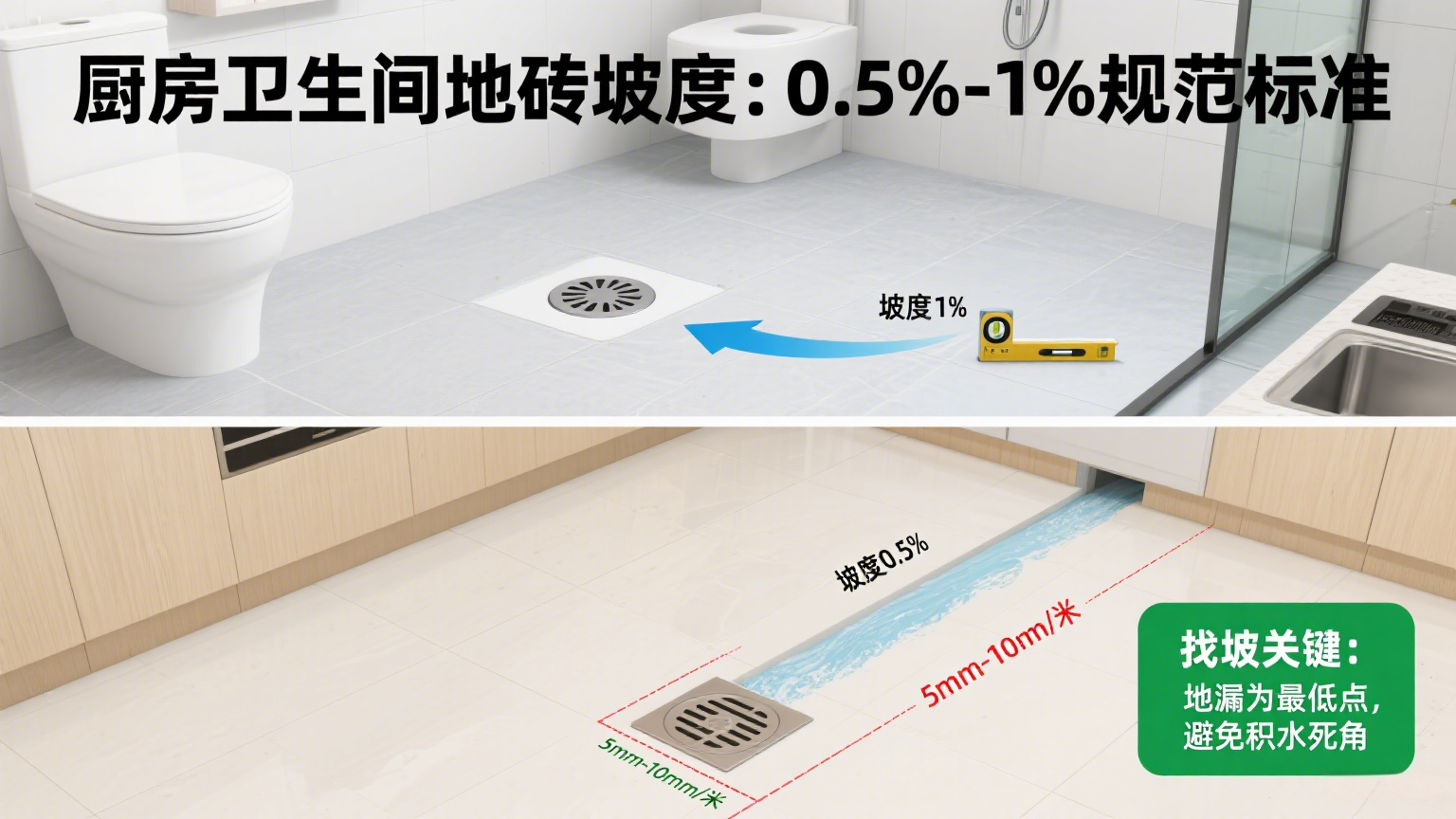 厨房和卫生间是家庭用水高频区域,地砖坡度直接决定排水效率 —— 若坡度不当,易出现地面积水、滋生细菌甚至渗漏楼下的问题,因此坡度设置是厨卫地面施工的核心标准之一。