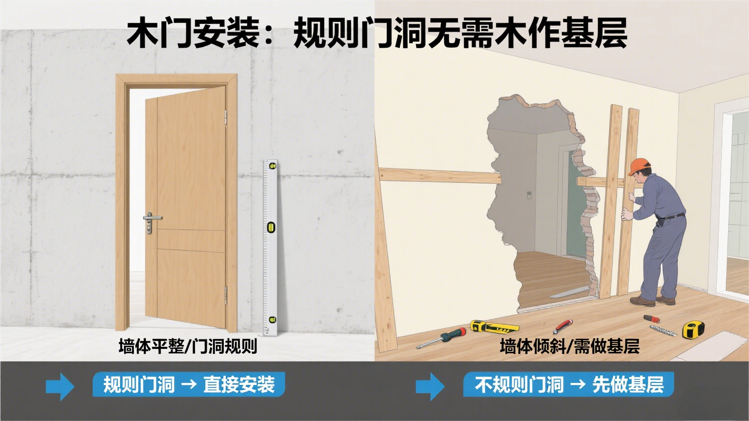 木门安装的稳定性与门洞基础密切相关,木作基层(通常由木方、细木工板搭建)的核心作用是找平、加固不规则门洞,但并非所有情况都需额外施工。判断是否做木作基层,关键取决于门洞的 “规则程度”,这直接影响安装效率与后期使用效果。
