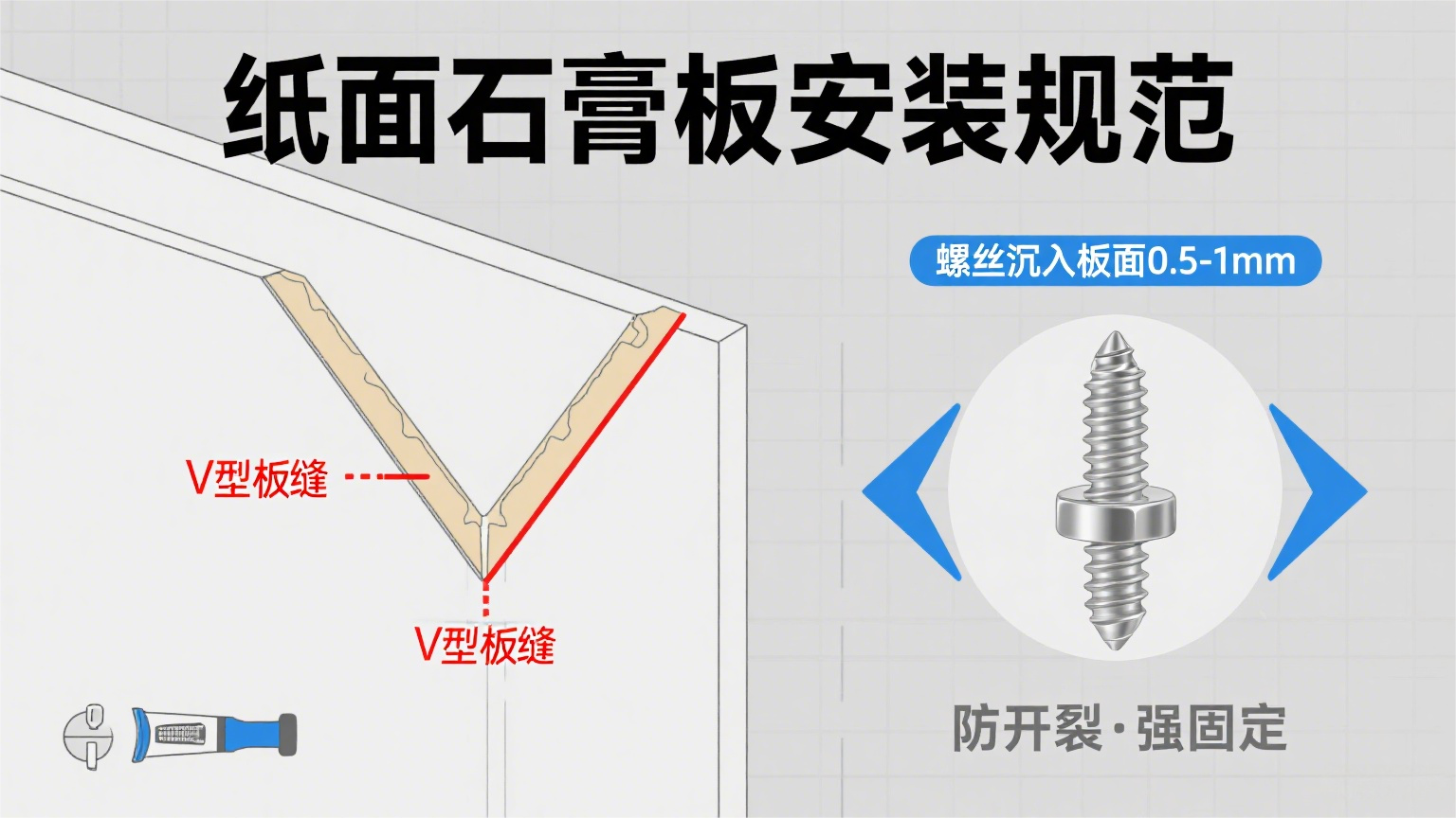 在纸面石膏板安装中,板缝处理和螺丝固定是影响墙面平整度与耐久性的关键细节。合理的板缝造型与螺丝沉入深度,能减少后期开裂风险,保证施工质量。