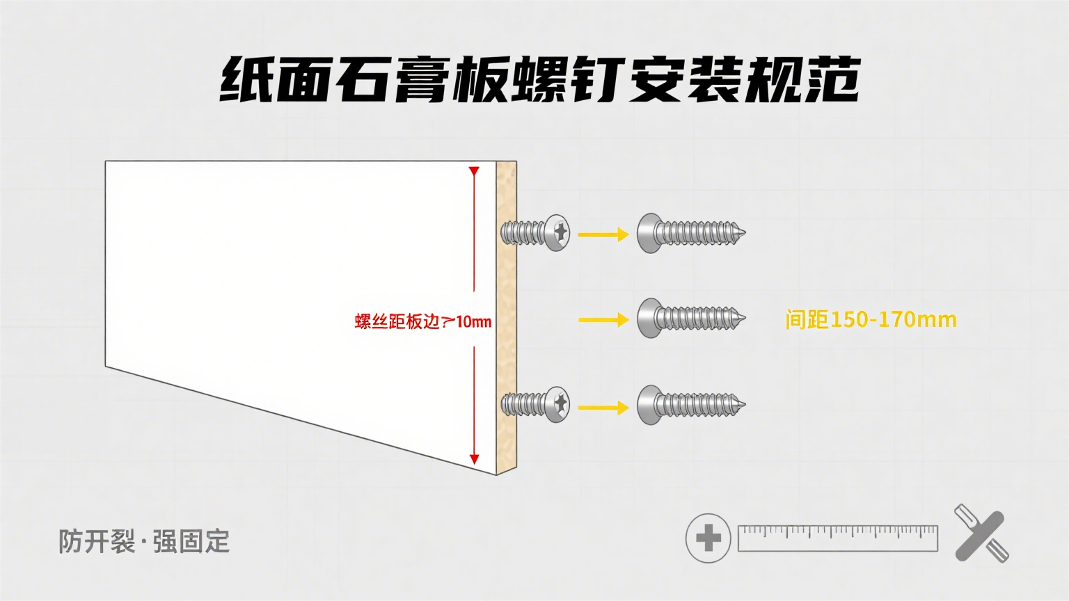 在纸面石膏板安装施工中,螺钉的固定方式直接影响板材的稳定性和使用寿命。若螺丝距离板边过近或间距不合理,易导致板材开裂、松动。那么,采用螺钉法安装时,螺丝距板边应大于多少?螺丝间距为多少呢?