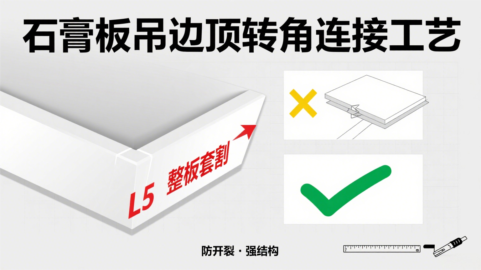 在石膏板吊边顶施工中,转角处是结构薄弱点,连接方式不当易出现开裂、变形等问题,影响吊顶的美观与耐久性。因此,转角处的连接工艺有明确规范。