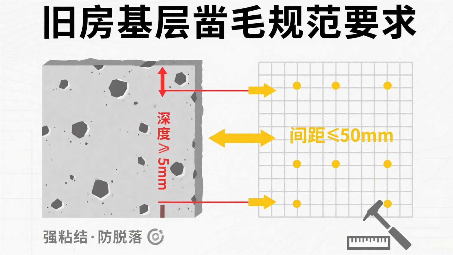 旧房基层凿毛,深度不应小于多少?间距应不大于多少?