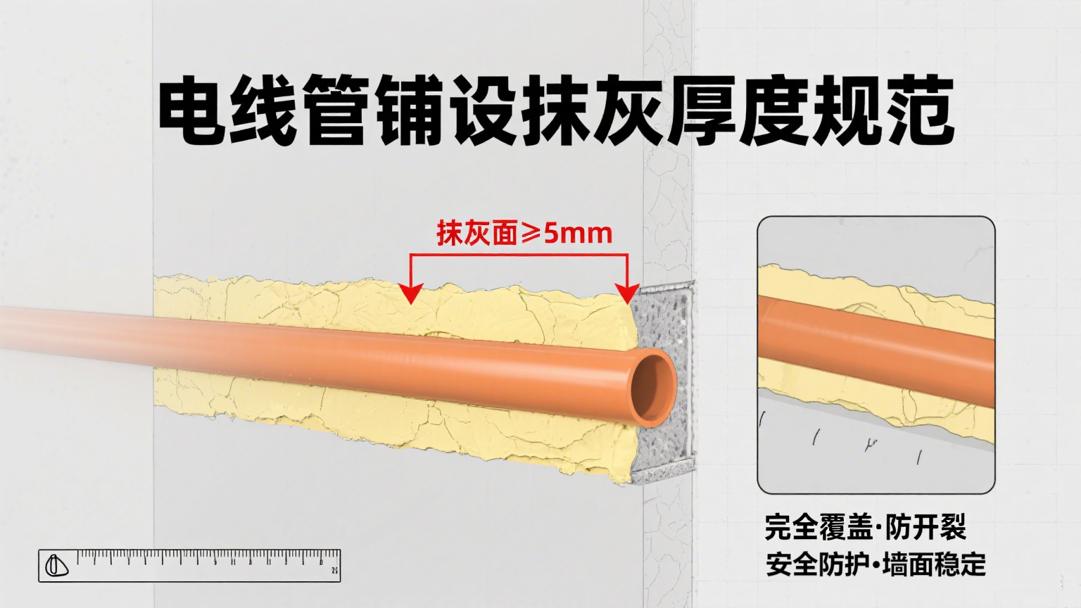 在电线管铺设的隐蔽工程中,最终抹灰面的厚度是保证管线安全与墙面质量的关键细节。若抹灰过薄,可能导致管线暴露或墙面开裂,影响整体装修效果与使用安全。