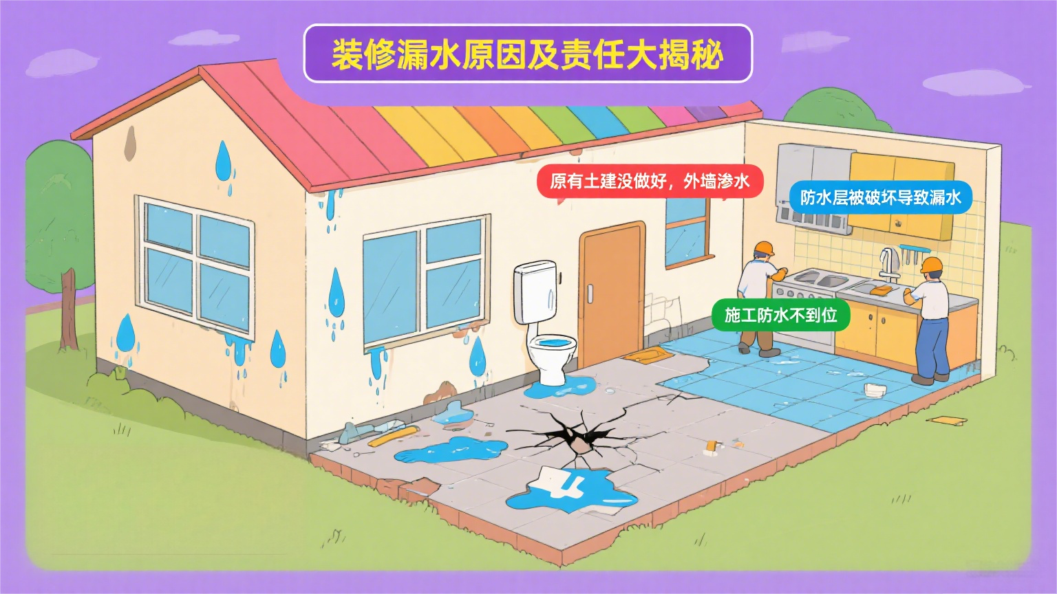在装修过程中,漏水是不少业主会遇到的烦心事,不仅影响居住体验,还可能造成财产损失。很多人疑惑,好好的房子为什么会漏水,出现漏水后该由谁来负责维修?下面通过问答形式,为你详细解析装修漏水的常见原因及责任划分。