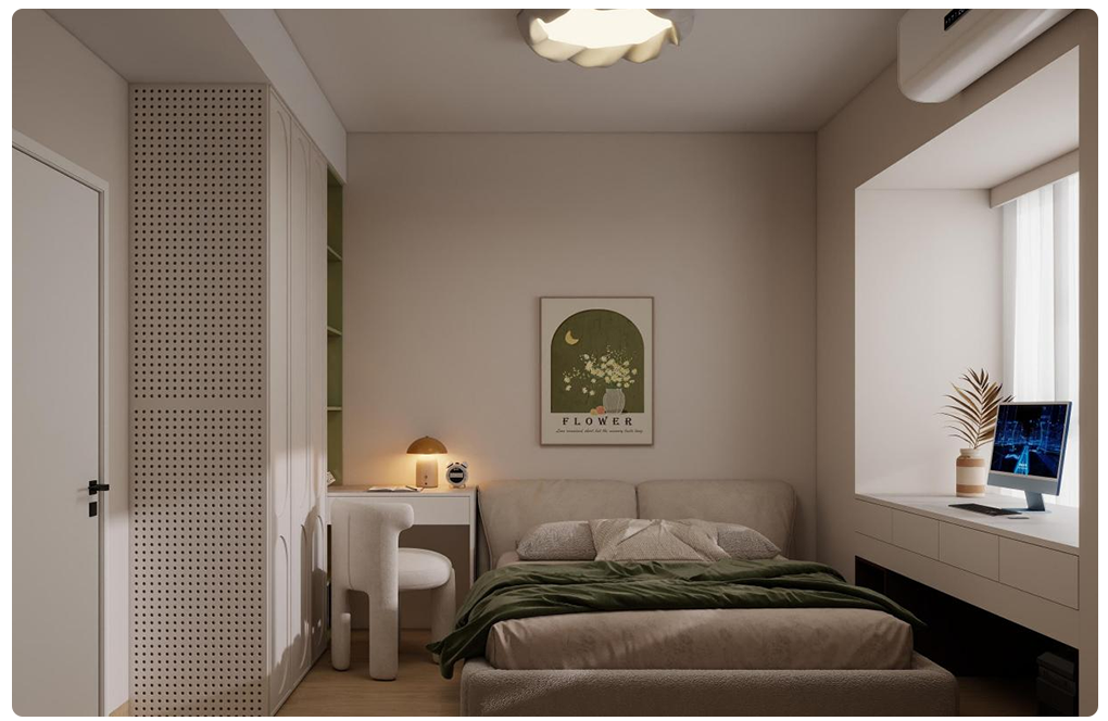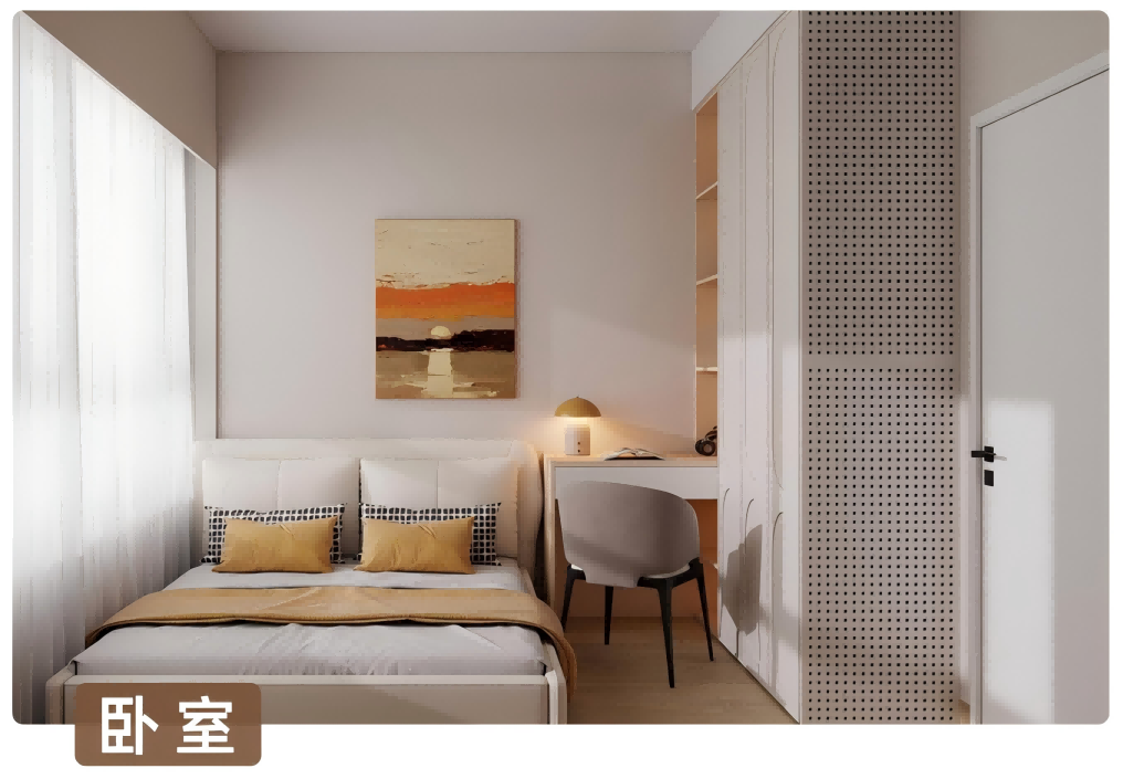 卧室:色调柔和,墙面、家具多为浅米色等温暖色系,搭配简约装饰画、温馨灯具,空间虽小但布局精巧,营造静谧休憩氛围 。