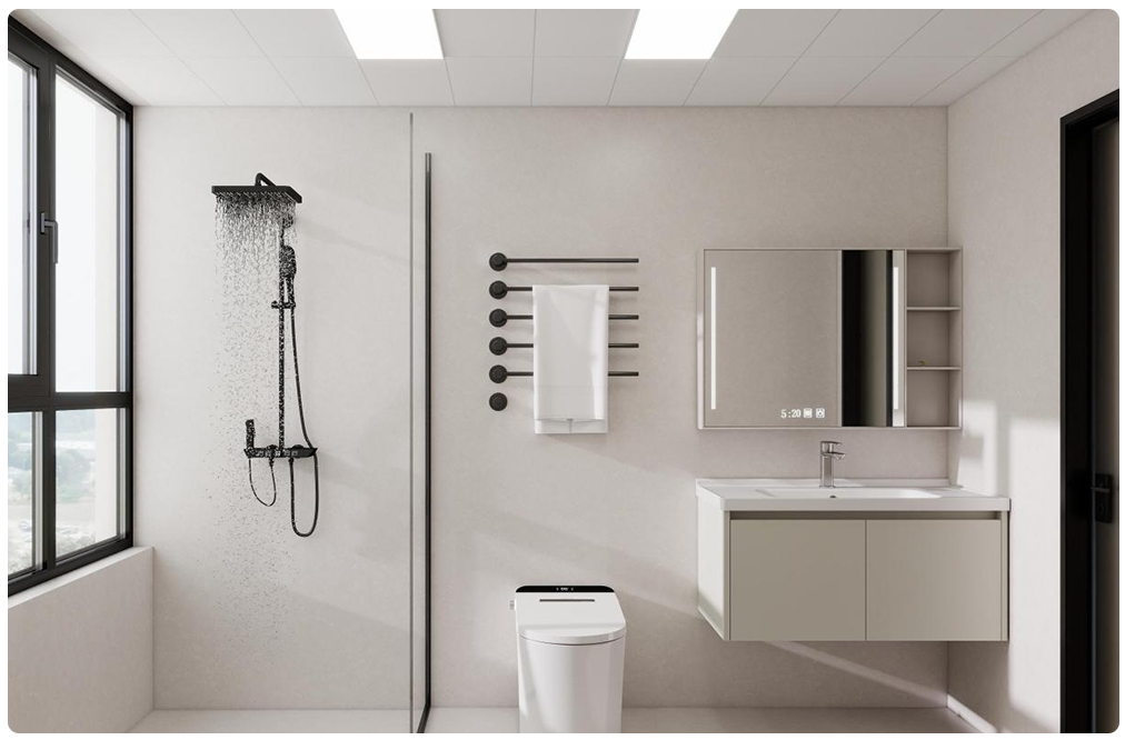 卫生间:以简洁白调为主,搭配黑色五金件,干湿区布局合理,智能马桶、镜柜等提升便利性与整洁感,尽显简约精致。