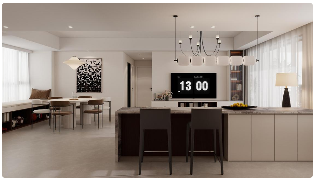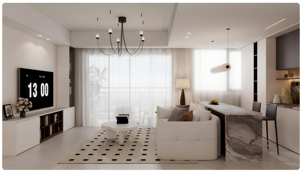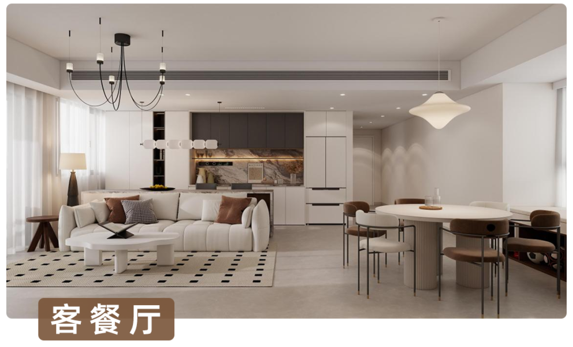 客餐厅:空间开阔通透,浅色调为主,搭配简约吊灯、柔软沙发、精致餐桌 ,兼具休闲与用餐功能,温馨又实用。