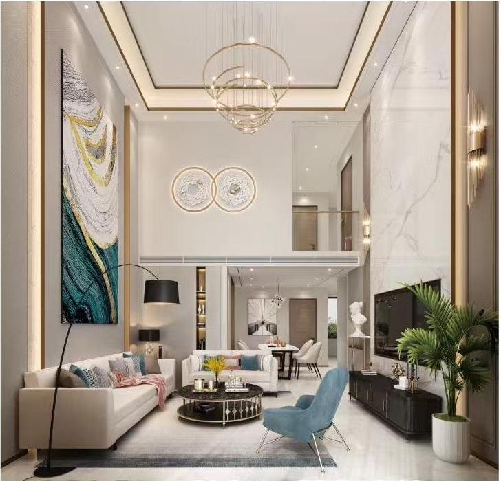材质运用:大理石、木质、金属、皮质等多元材质融合,借不同质感碰撞出轻奢火花,如大理石地面的温润、金属线条的精致、皮质家具的细腻;