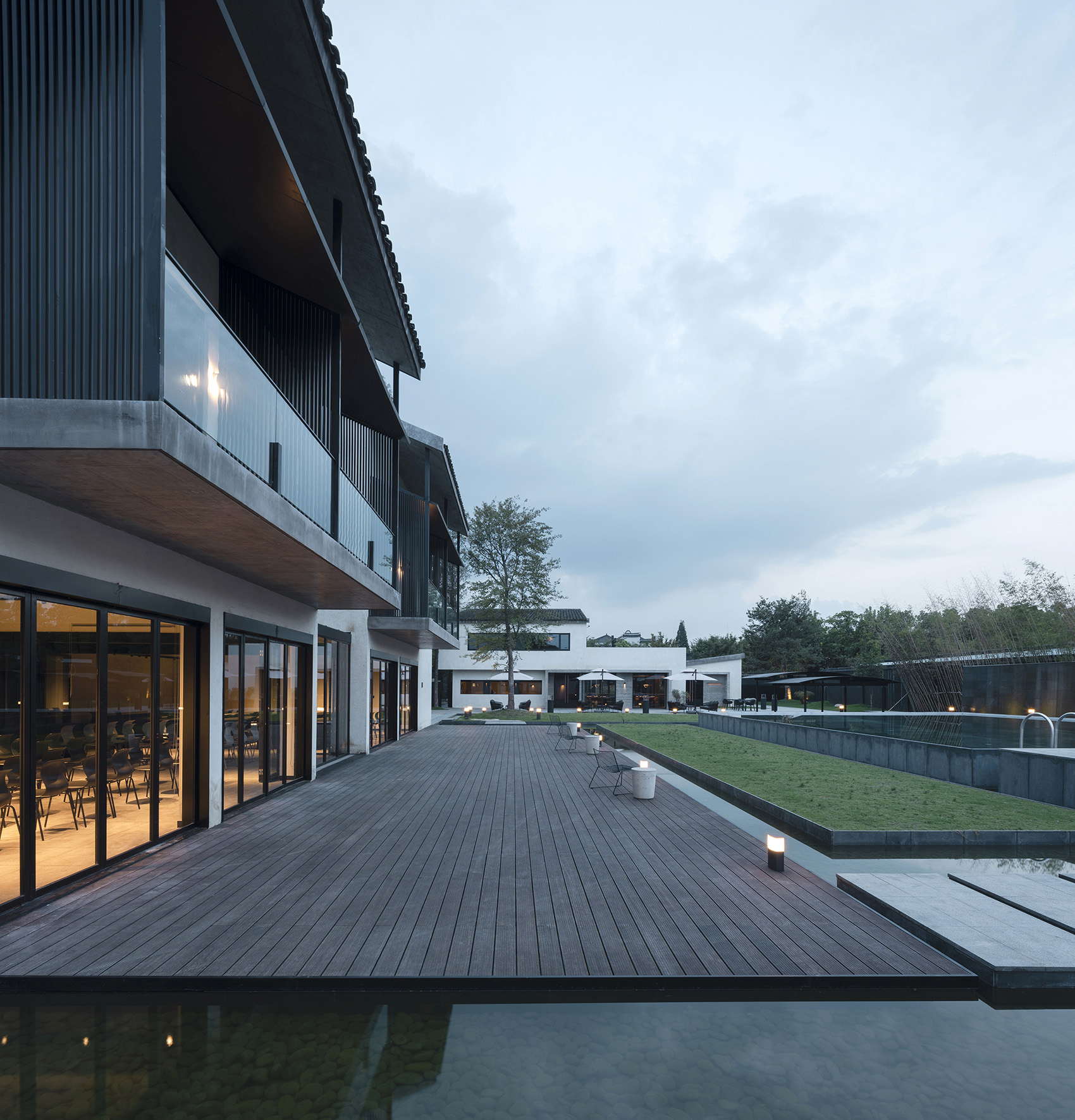 公共休闲区:依托临水建筑打造开放式休闲平台,木质铺装延伸至水边形成亲水空间,设简约户外家具,适配休闲交流、观景赏水。建筑立面用深色木质与玻璃材质,通透显质感,室内暖光透过玻璃洒向平台,模糊室内外边界。结合水景造景,水面倒映建筑与天空,强化新中式禅意氛围,提供自然惬意公共活动场景,促进互动交流。