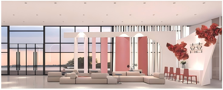 庄严颁证区:聚焦婚姻登记的仪式感,以现代简约手法融合庄严与浪漫。红白主色调凸显神圣,弧形卷轴造型打破常规墙面形态,搭配精致花艺缠绕,环绕颁证标识与纪念日期,象征爱情的延展与圆满。整齐排列的简约白色坐榻,为亲友观礼提供舒适空间,顶面线性灯光与简洁造型,烘托出庄重又不失温馨的颁证氛围,见证新人步入婚姻的关键时刻。