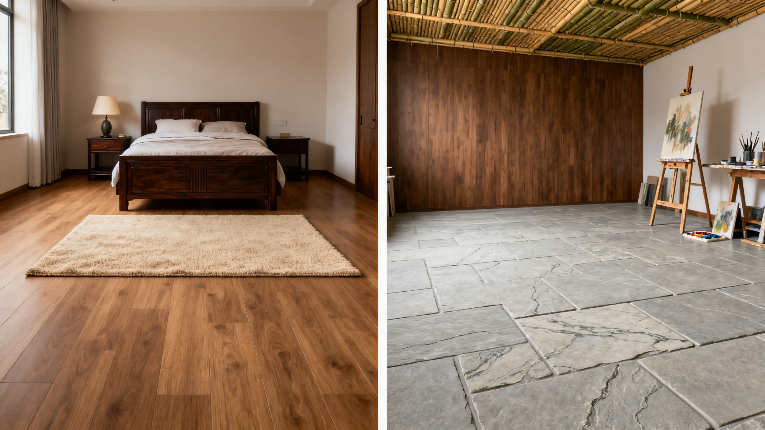 要是家里有专属的艺术工作室,地面就能大胆追求 “氛围感”。比如铺青石板,自带古朴质感,再搭配竹藤吊顶、木饰面墙面,瞬间就能营造出返璞归真的艺术氛围,让创作灵感更易迸发。