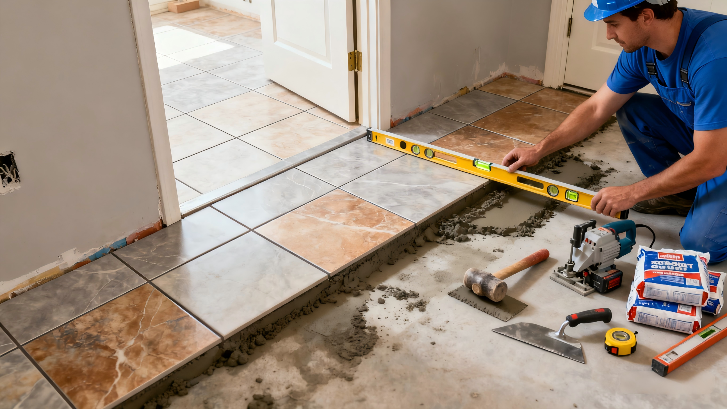当房间地面选择铺贴瓷砖时,门洞处理相对简单。由于瓷砖铺贴完成后,地面会自然抬高 50-60mm,施工时只需精准把控铺贴高度,让房间(客餐厅)地面铺贴后的高度比厨卫地面高 20-30mm 即可。这个高度差既能有效避免厨卫积水倒灌进房间,又不会因高度差过大影响日常行走,且瓷砖本身具备良好的防水性,无需额外增设复杂挡水结构,就能实现门洞处的实用与美观兼顾。