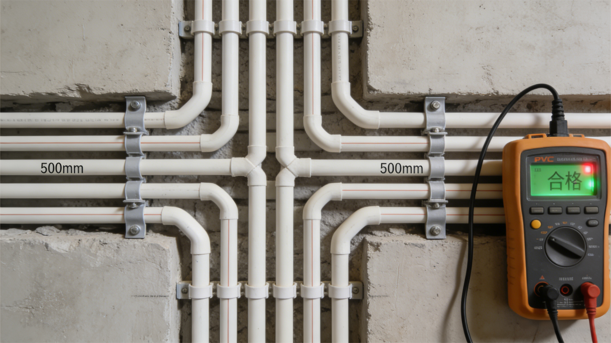 套管需每隔 500mm 进行固定,且套管表面要低于墙面 13mm 以上,为后续墙面封闭预留空间。此外,套管内电线严禁出现接头,电线有效截面不能超过 PVC 管径的 40%,防止电线过度拥挤导致散热不良,引发安全隐患。