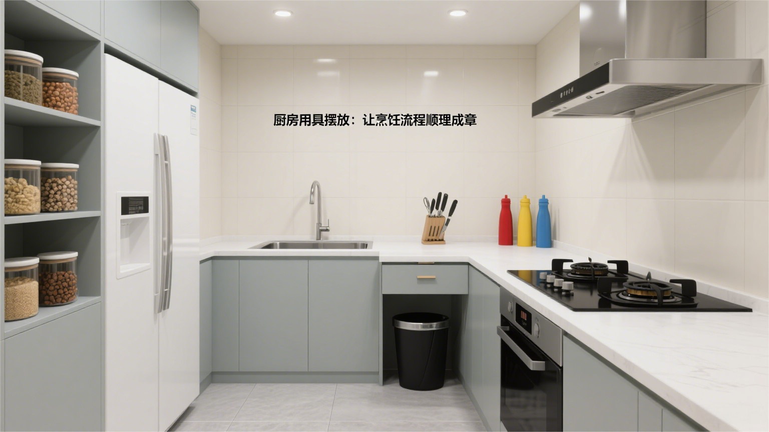 厨房用具摆放需遵循烹饪流程与使用频率:取料区(干货、冰箱、米桶)就近集中;清洗区(削皮工具、沥水篮、垃圾桶)围绕水槽布局;切配区(刀具、砧板)兼顾安全与顺手;烹调区(炊具、调料)触手可及;盛装区(碗碟、消毒柜)靠近清洗区。合理摆放让烹饪更高效顺畅。
