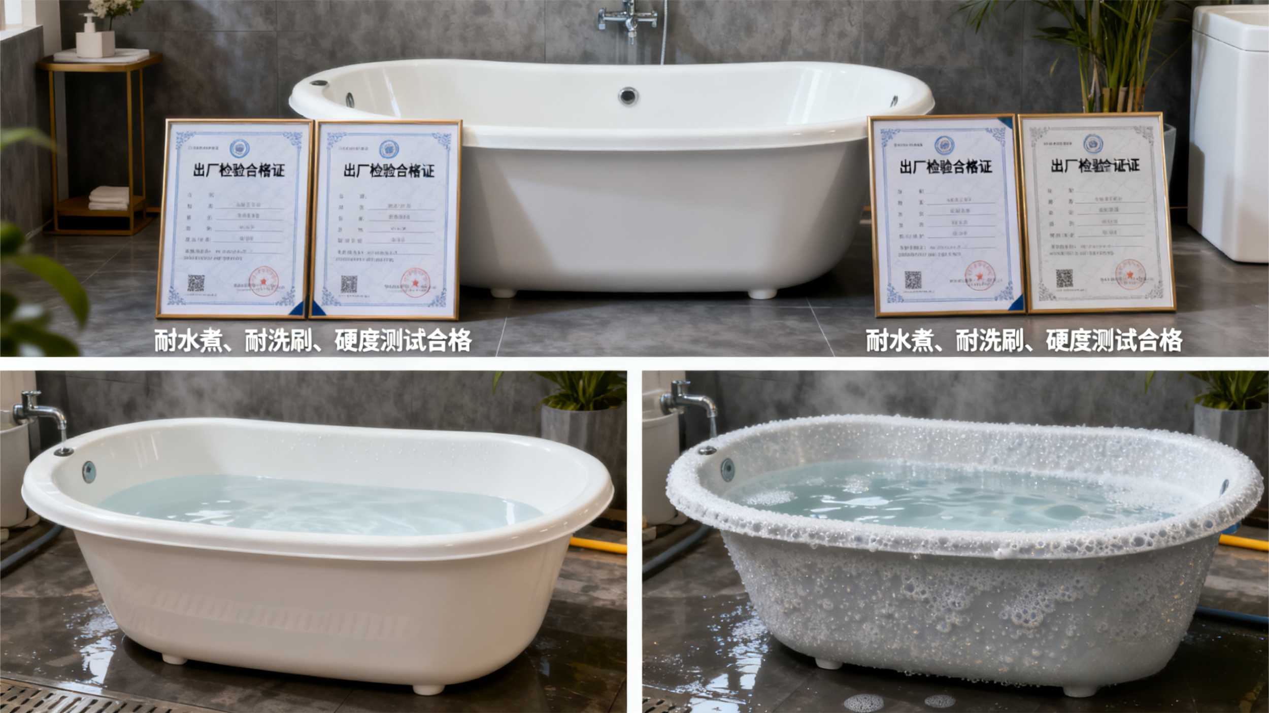 耐用性差:若条件允许,可简单测试(或询问商家测试结果)—— 劣质浴盆用沸水浸泡后会快速失去光泽,放置一段时间后还可能出现起泡、开裂,无法承受日常热水使用需求。