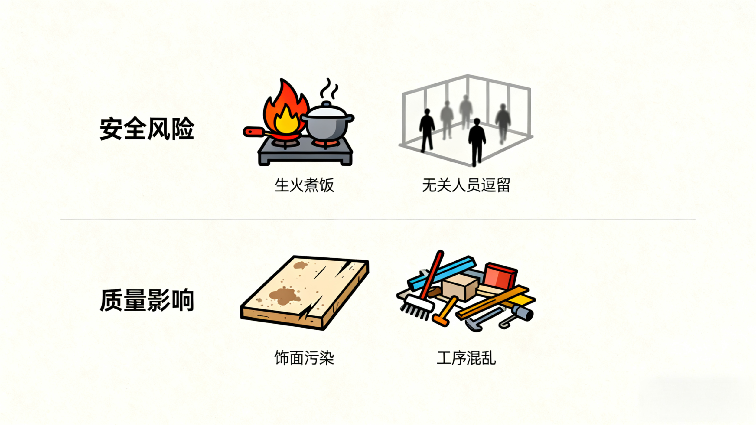 施工人员的家属等无关人员可能在工地逗留,既妨碍正常施工,还容易引发安全事故;更危险的是,工地生火煮饭,极易引发火灾,给房屋和人员安全带来致命威胁。