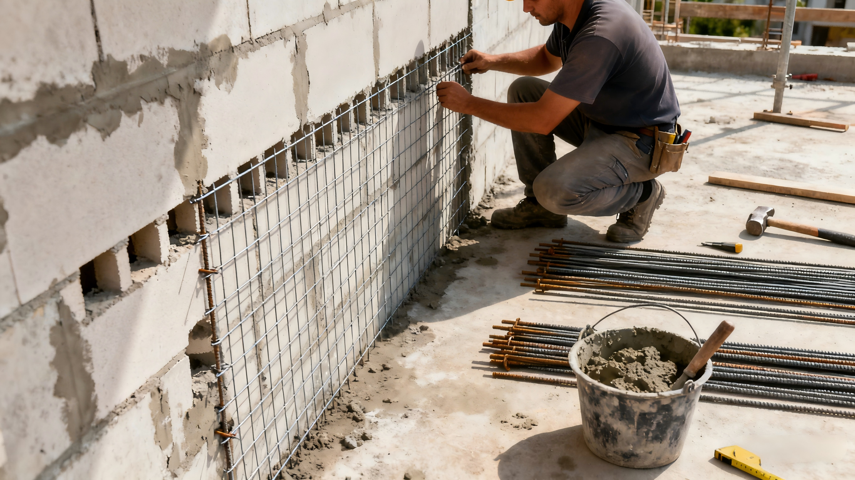 新墙与老墙搭接处,每两块砖需留马牙槎,设置两根直径 6mm、长度 500mm 的拉接钢筋,间距 50cm,接头处挂钢丝网后再抹水泥砂浆贴砖,增强墙体整体性;