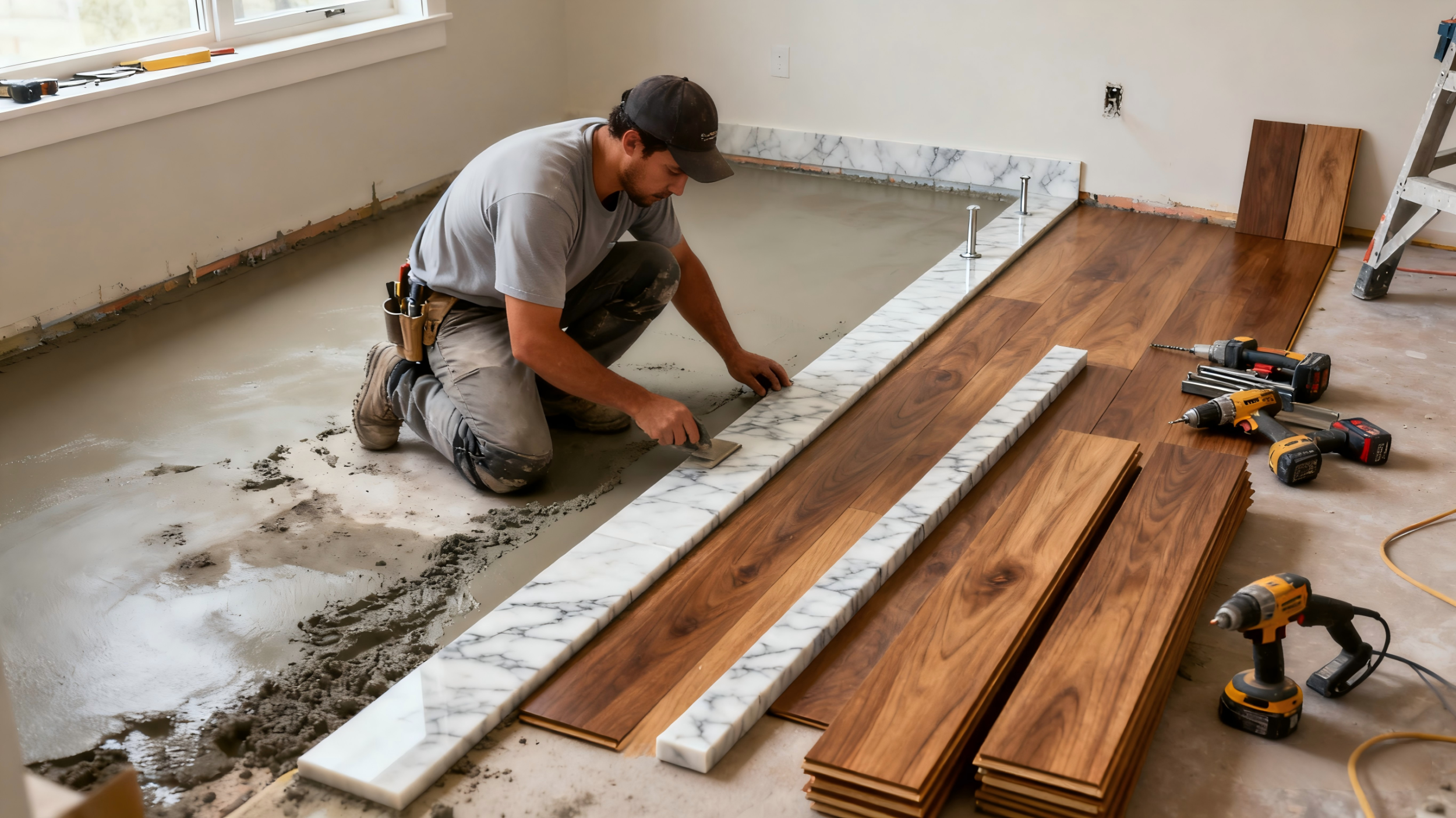 若房间打算安装复合木地板,且居室层高足够(2.7m 以上,有抬高空间),第一步需对房间地面进行整体找平,通过找平缩小与厨卫地面的高度差距。待找平工作完成后,在门洞位置安装一块大理石挡水条。这样处理后,能让厨卫地面与房间(客餐厅)地面保持持平或略低的状态,大理石挡水条可有效阻挡厨卫可能溢出的水流,避免水分渗入复合木地板内部,防止地板因受潮出现变形、起翘等问题,为复合木地板提供周全保护。