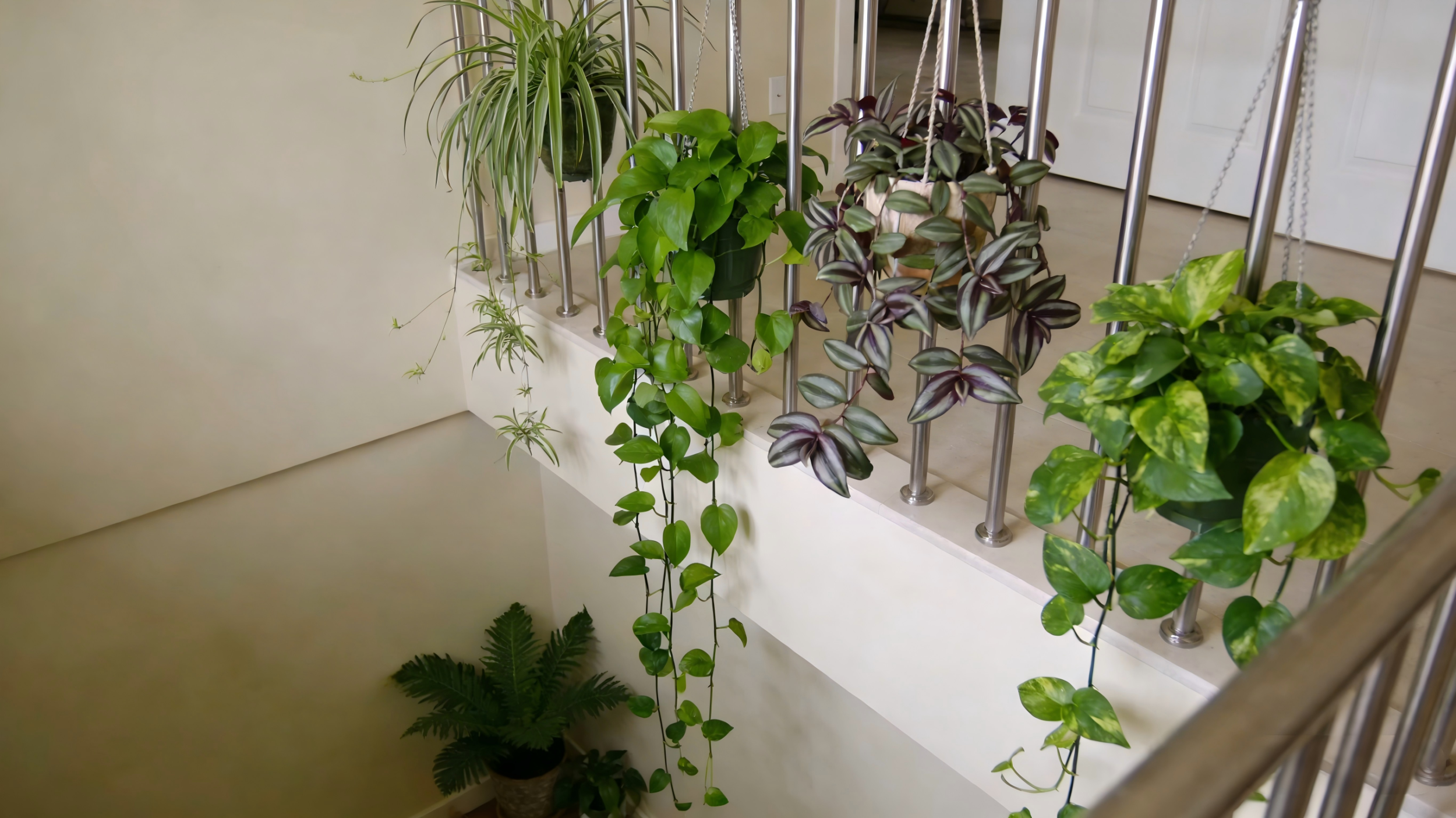 复式楼空间广阔且富有层次感,室内楼梯作为上下层连接通道,光照较差,梯道绿饰需优先选择耐阴品种。可在栏杆处悬挂吊兰、绿萝、垂叶椒草、吊竹梅等小巧下垂的植物,既能弥补光照不足的短板,又能为楼梯增添飘逸灵动的美感,丰富空间层次。