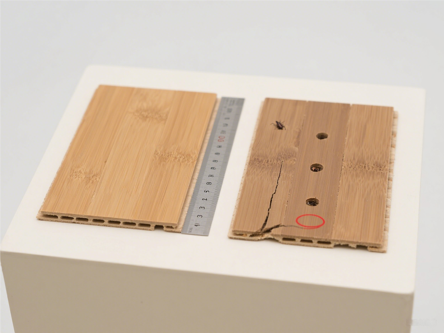 仔细检查竹地板表面,不能有虫眼、开裂痕迹,触感要光滑平整,无凹凸、翘曲;边缘需平直无缺损 —— 若有虫眼,后期可能滋生蛀虫;若边缘不直,拼接后会留缝隙,影响美观和防潮效果。