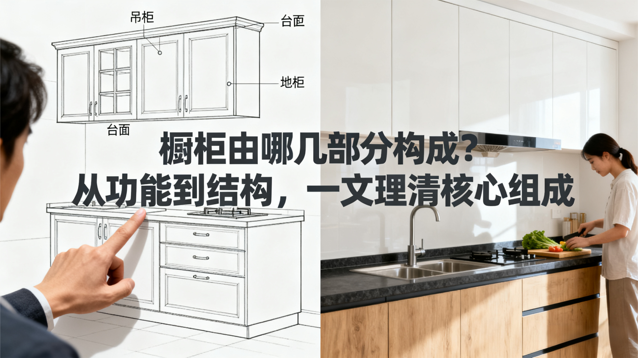 橱柜按功能分吊柜、台面、地柜,分别负责墙面收纳、烹饪操作、高频收纳;按结构分柜体、台面、门板、配件,柜体需环保牢固,门板有多种饰面,配件含结构与功能两类。了解这些组成,能更好选与用橱柜。